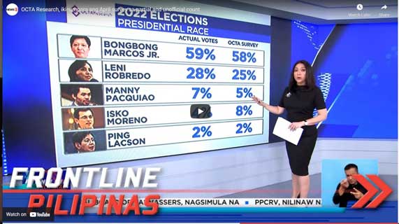 #FrontlinePilipinas | Ikinumpara ng OCTA Research ang huli nilang election survey sa kasalukuyang partial and unofficial count. #BilangPilipino2022 Follow News5 and stay updated with the latest stories!