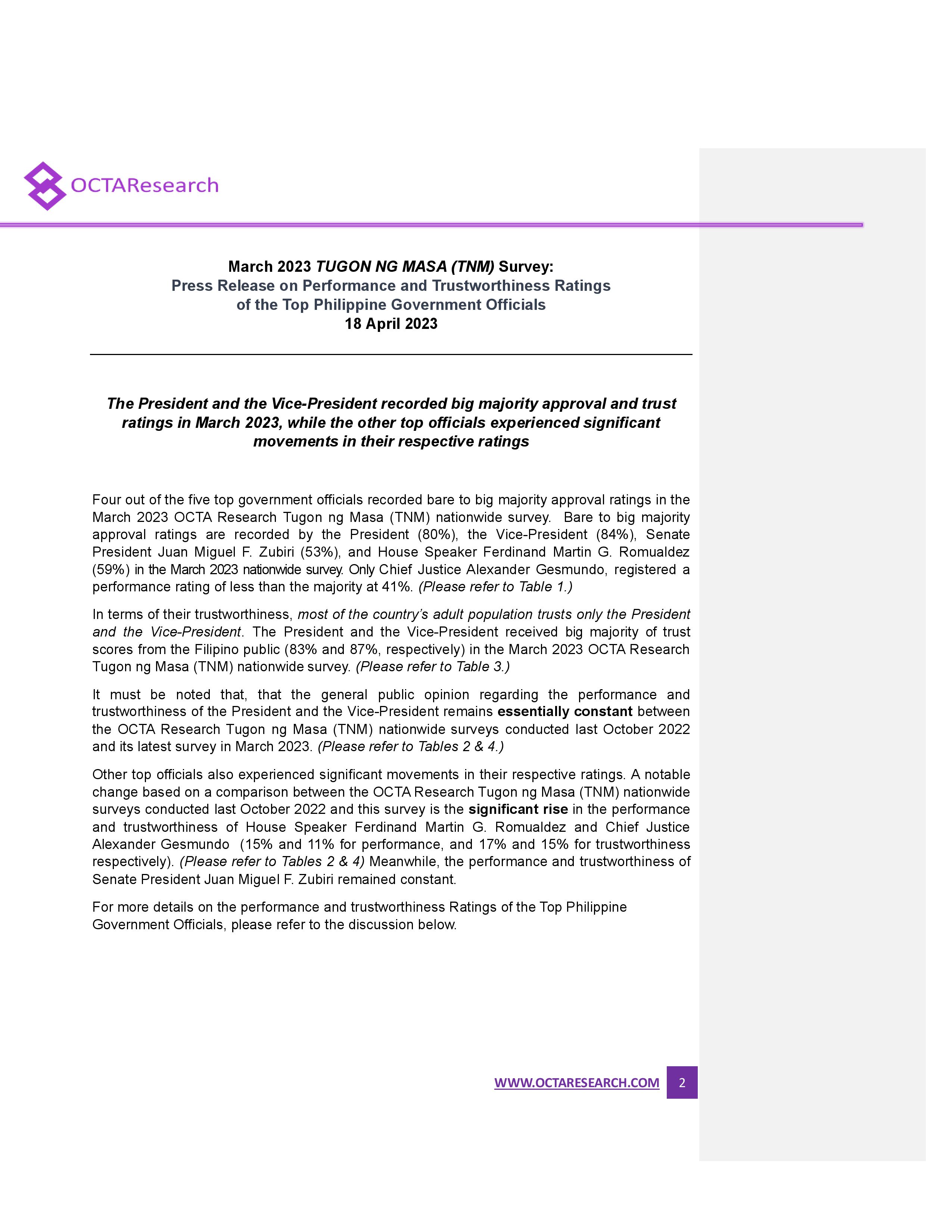 President Marcos and Vice President Sara Duterte continued to enjoy high performance and trust ratings in the latest survey conducted by the OCTA Research group.