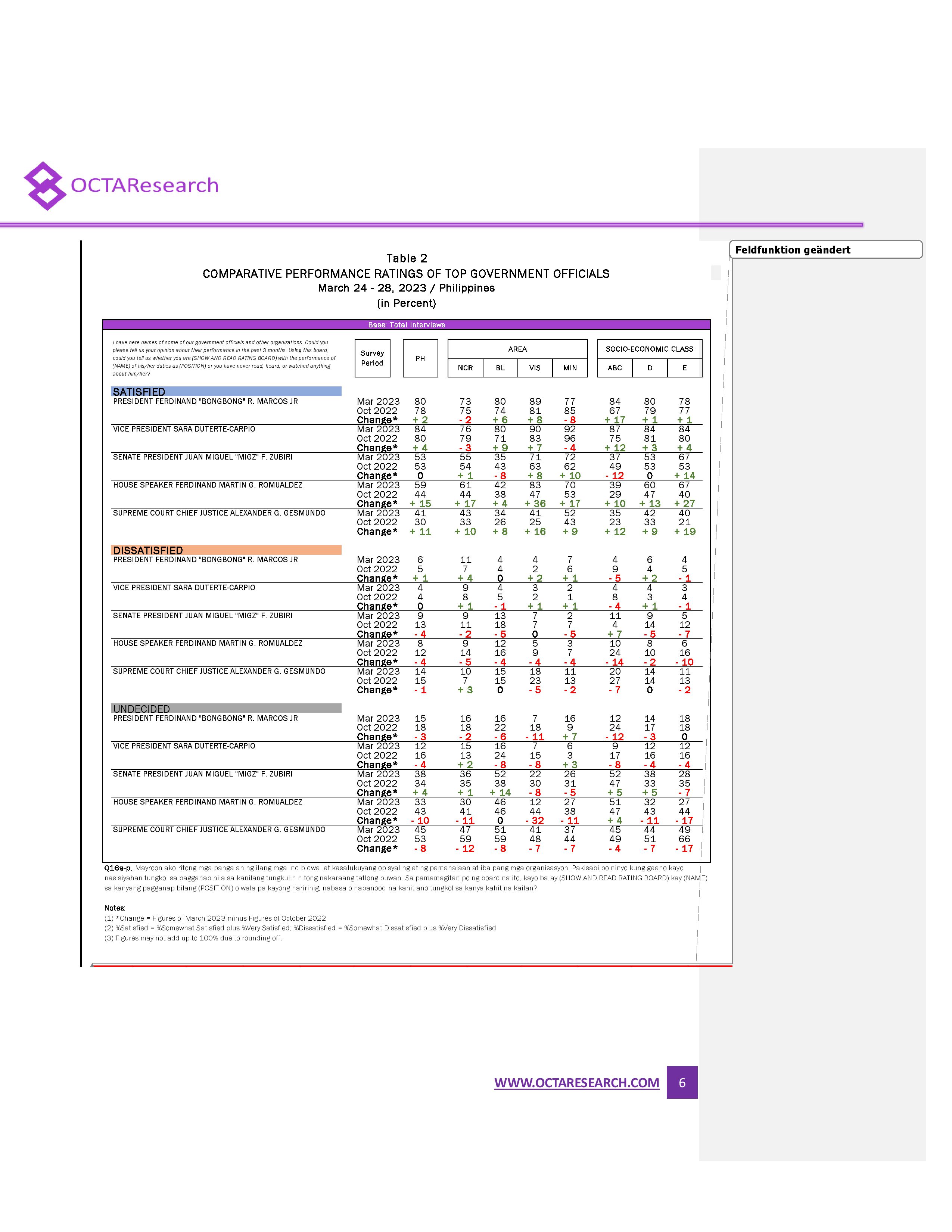 THE performance and trust ratings of President Ferdinand Marcos Jr. and Vice President Sara Duterte dipped in the second quarter, independent pollster OCTA Research said on Tuesday.