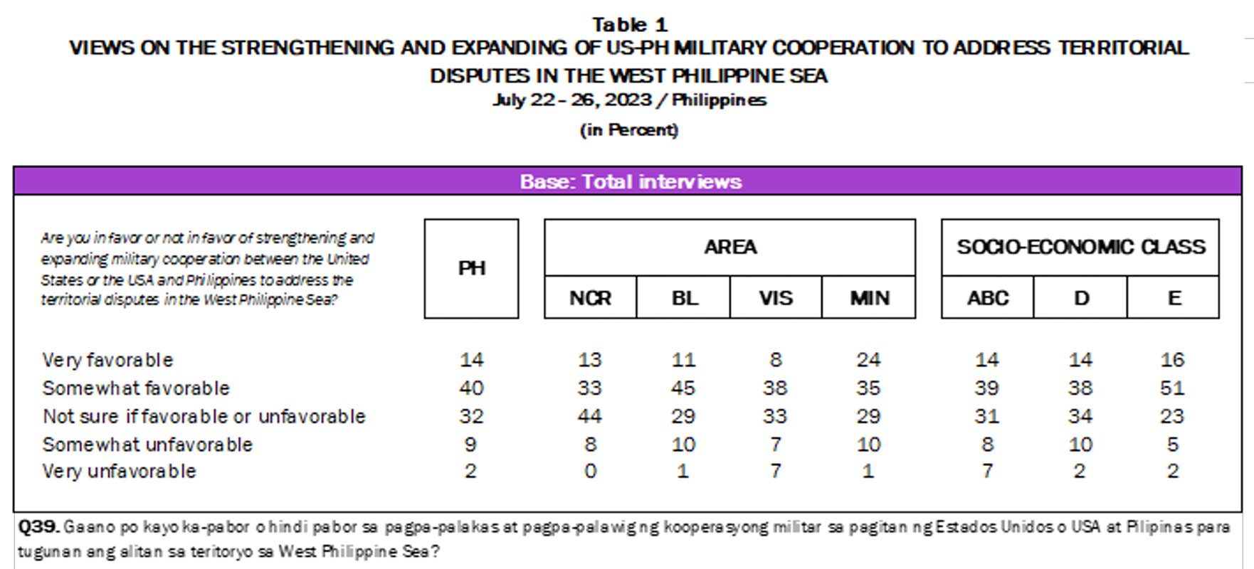 Fifty-four percent of Filipinos were in favor and 11 percent were not in favor of strengthening and expanding the US-Philippines military cooperation to address the West Philippine Sea territorial disputes.